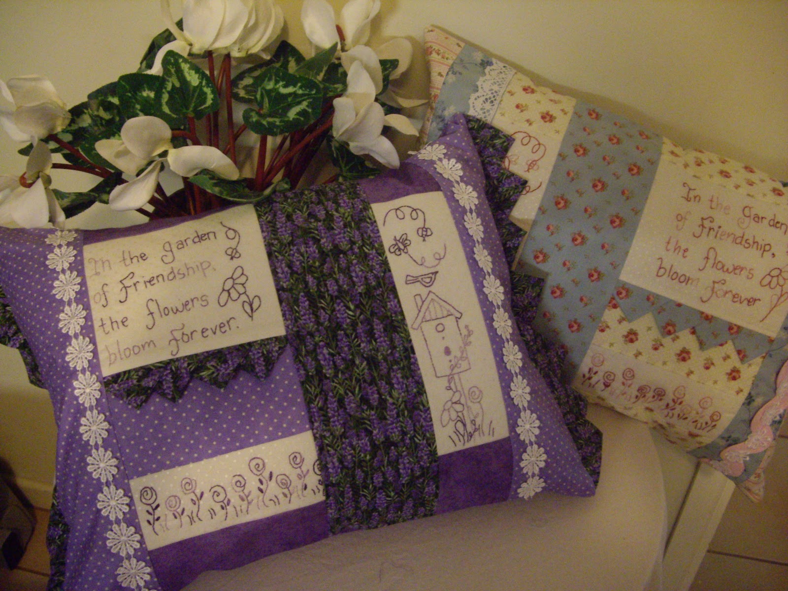 Remember the Sally Giblin stitchery from a few months back? Well I actually did 2 stitcheries one in mauve and one in pink so today I made them into cushions. Yeah! Two things finished.